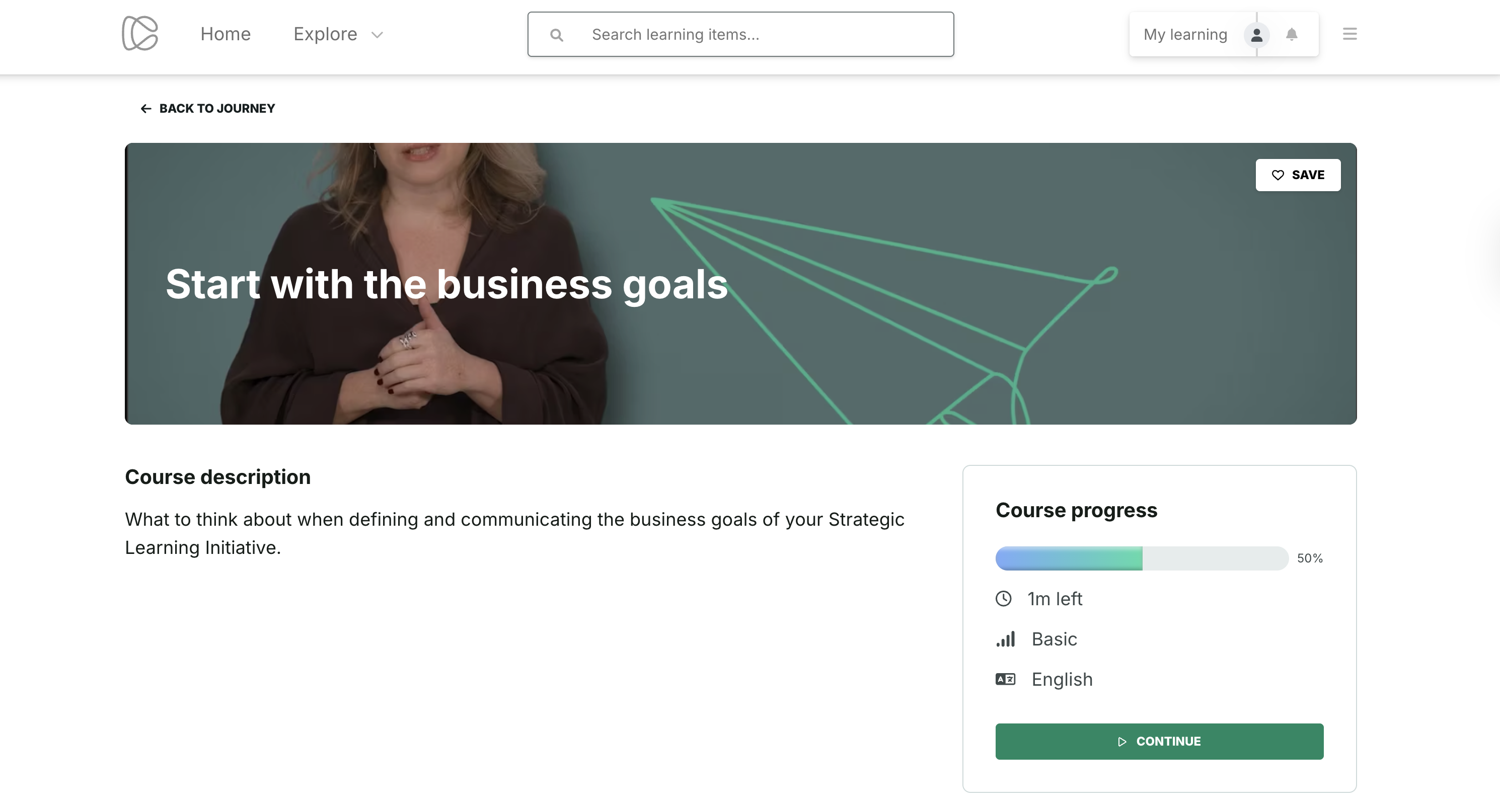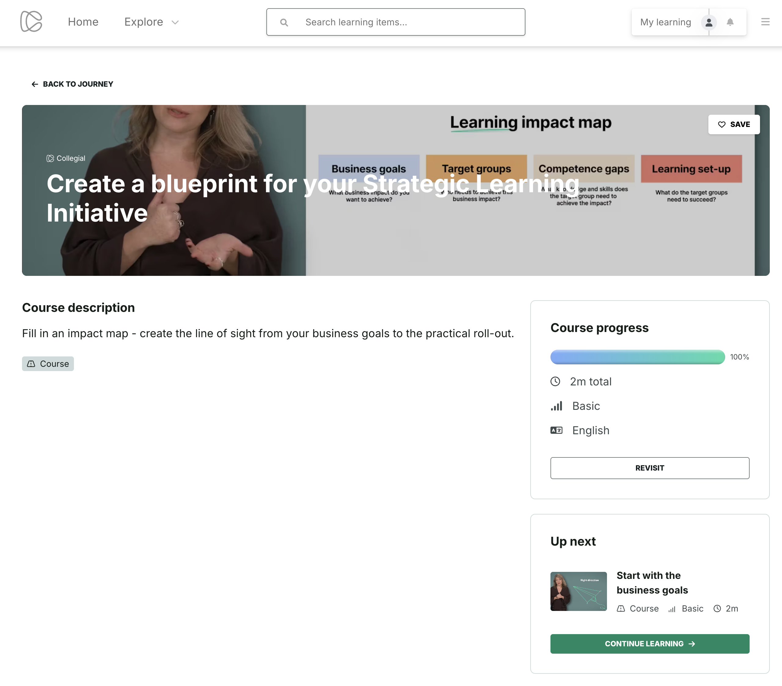 • If the item is part of a Journey, learners also see an Up next box and a Continue learning button showing the next item in the journey