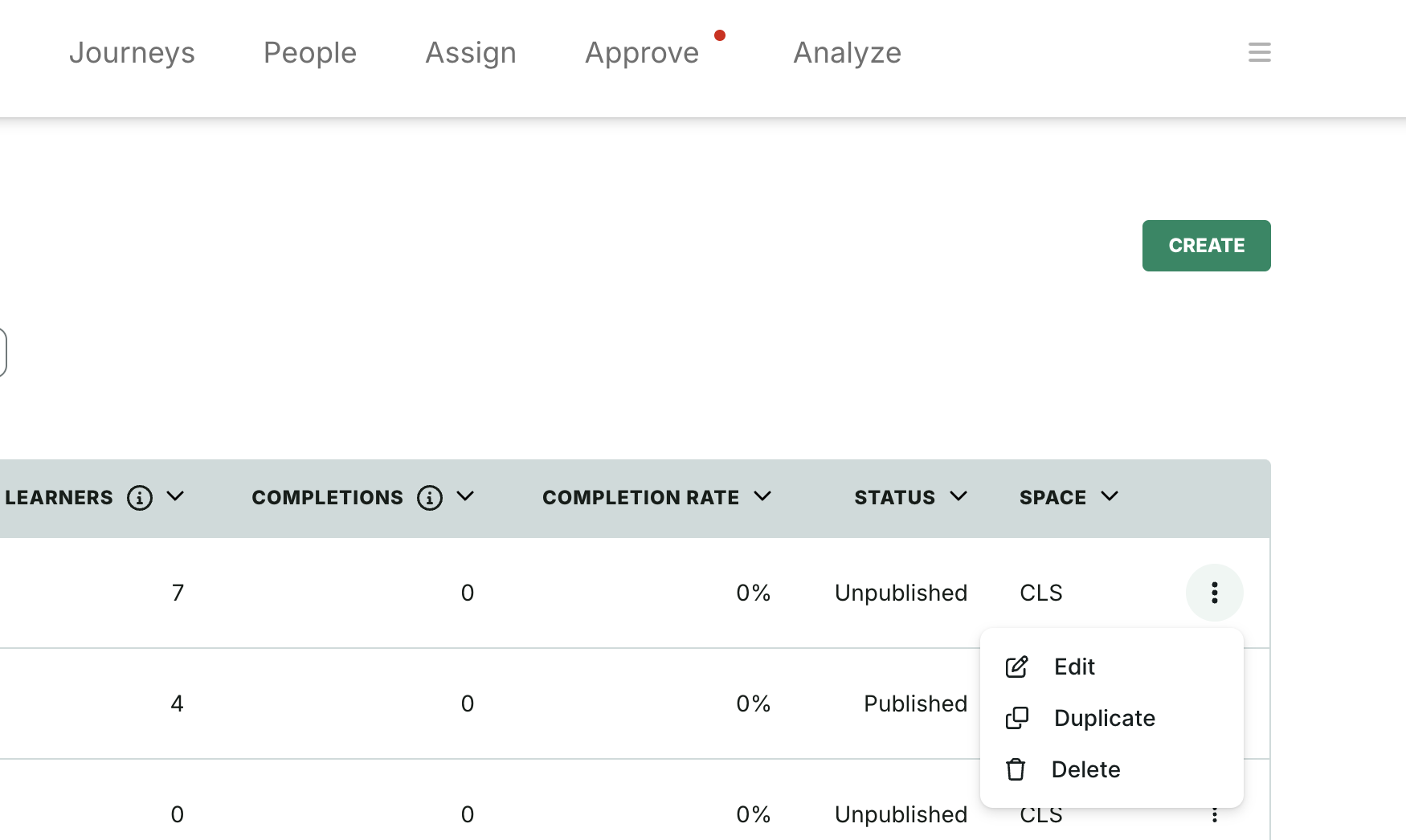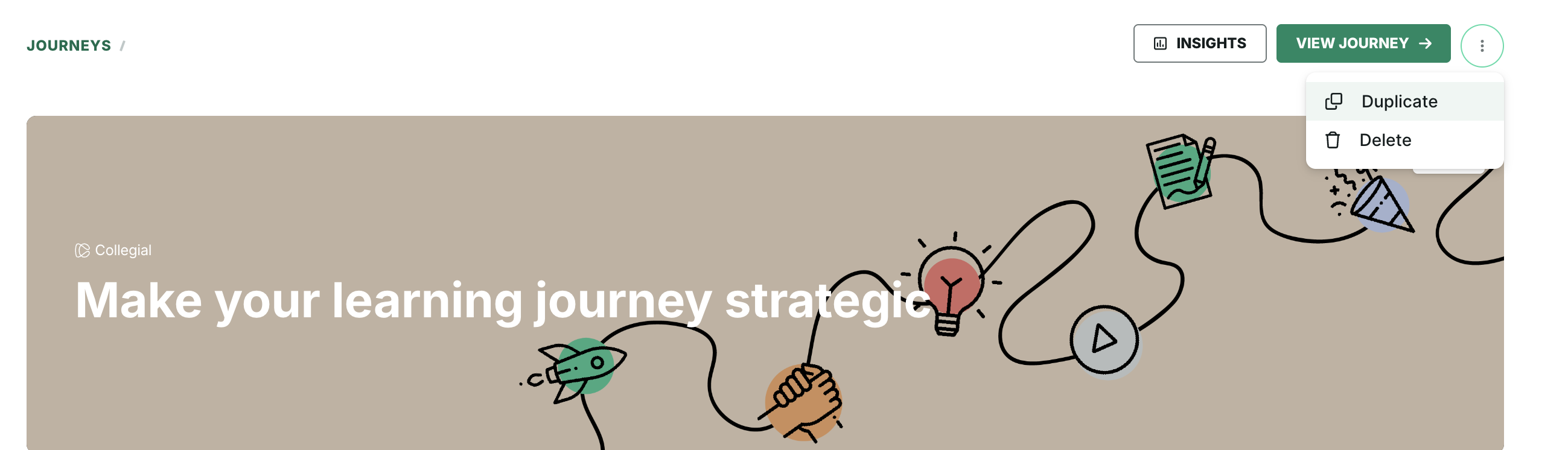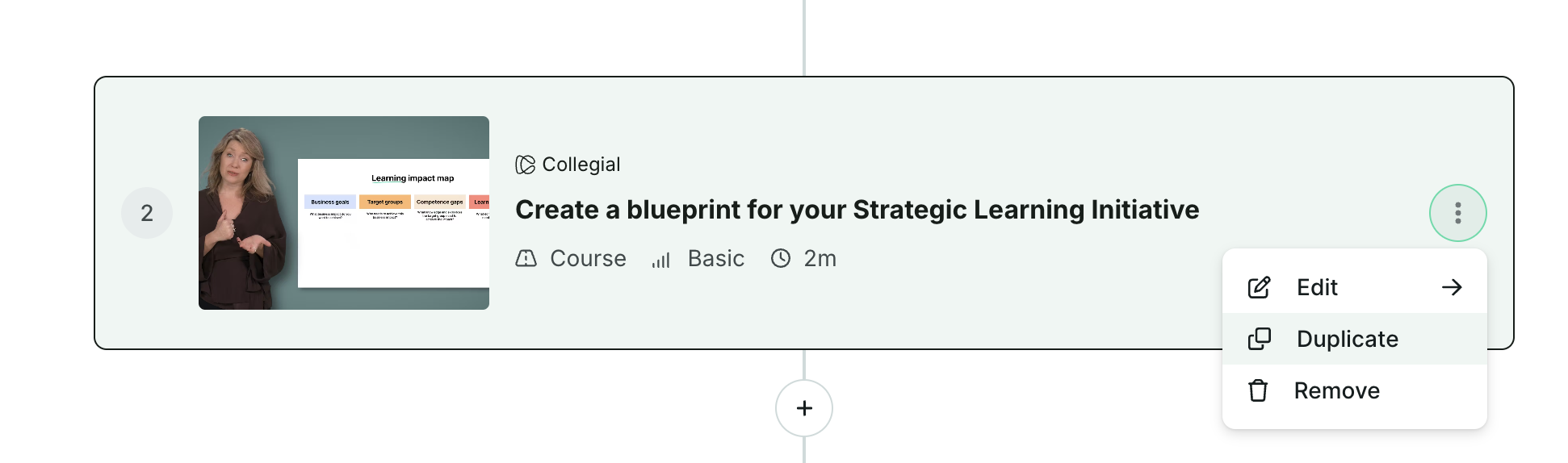 Courses, assessments, surveys, e-learning, seminars, webinars, and live events can be duplicated. After clicking Duplicate from the item’s menu the system copies the item and adds the item to the journey outline.