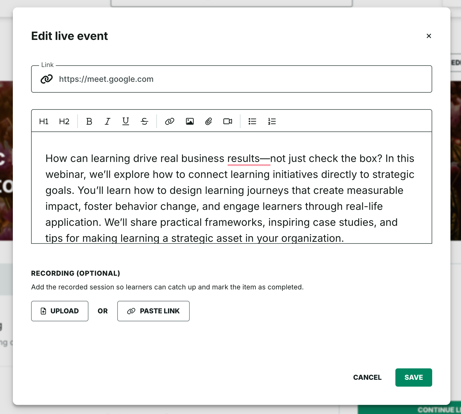 We’re introducing flexible completion for live sessions through post-event recordings. This aims to support learners who couldn’t attend the live event while giving admins more flexibility in how completion is tracked.