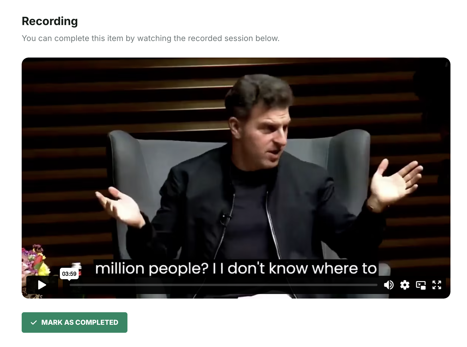 • Learners will see a Recording section on the webinar page with a Mark as completed button.