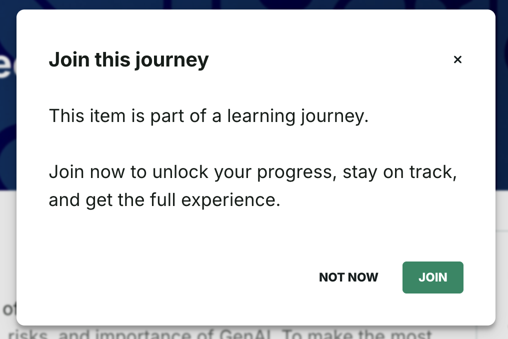 To make progress on any learning item in a Journey, learners are now prompted to join the Journey for the full experience. This aims to ensure progress tracking and guidance are consistent from the start.