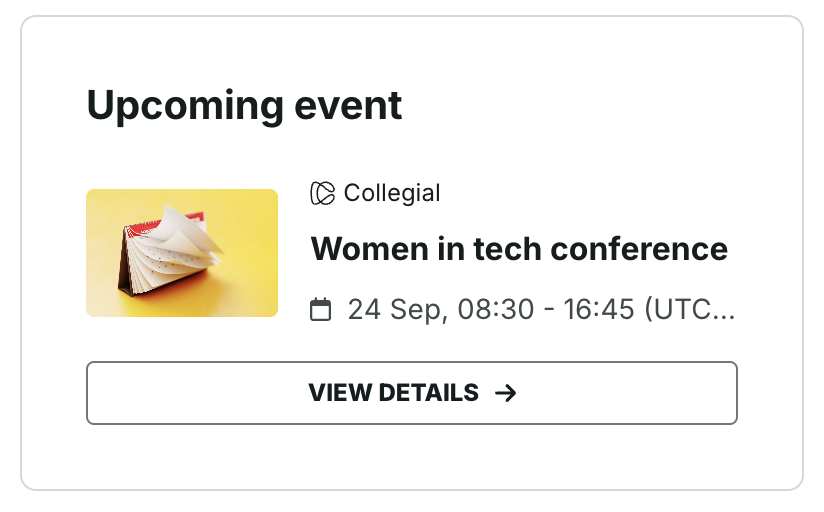 • When a live event exists, the container surfaces the next upcoming one with the date, time and location (when applicable) to guide attendance.