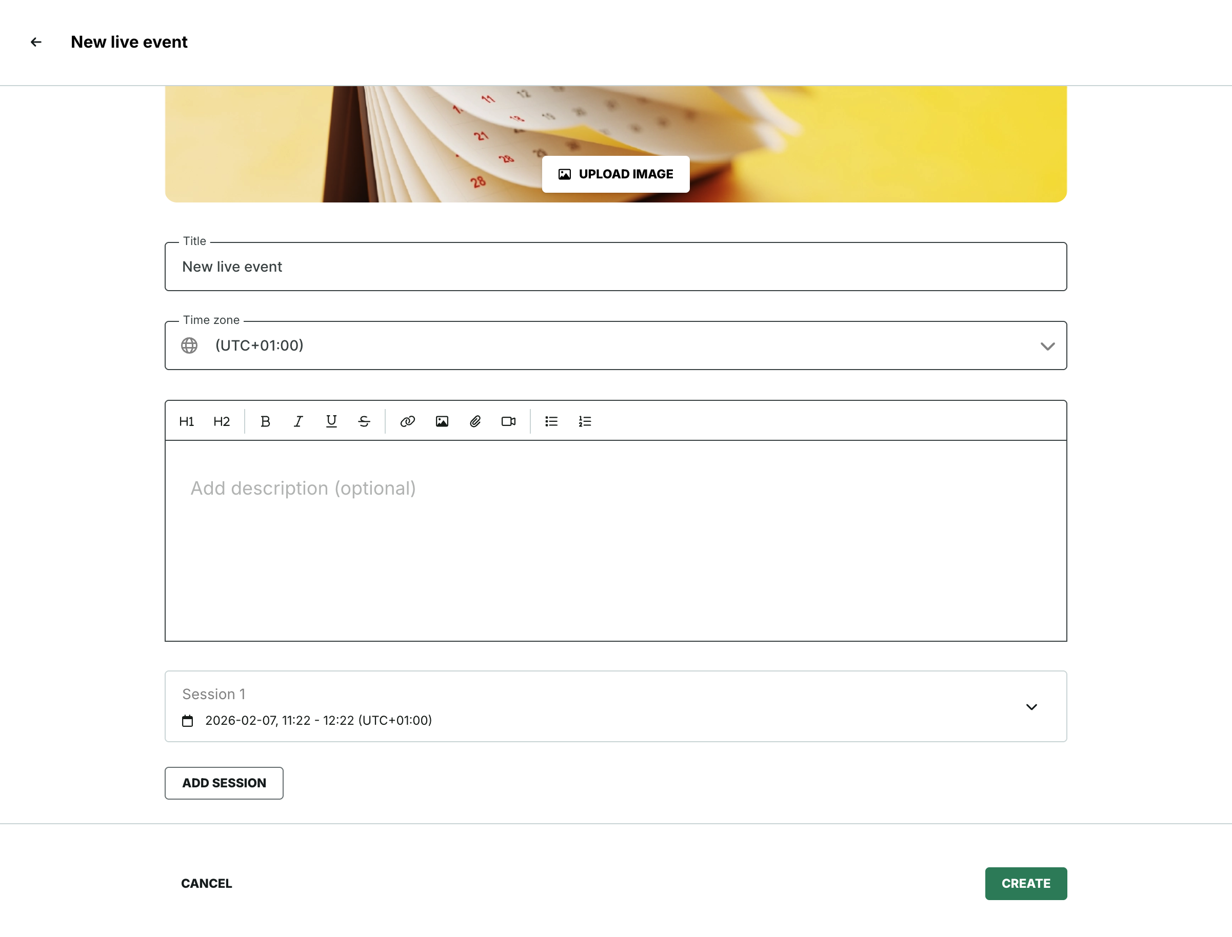 In the Live Event setup page, you can manage event details such as cover image, title, and description, and set up sessions in the sessions section:
