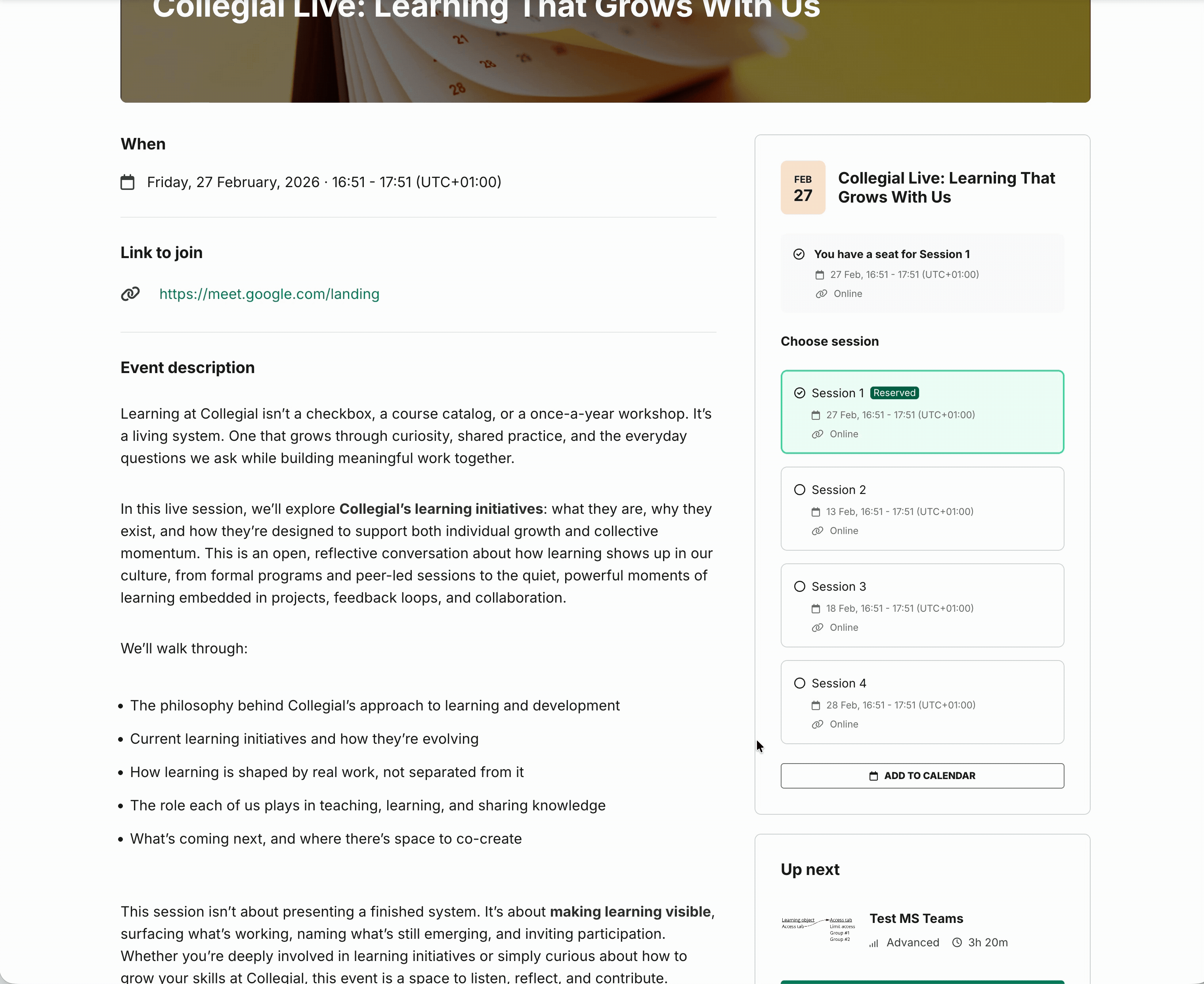 Live Events now support both single-session and multi-session formats. Learners always have a clear view of their assigned session and, when multiple sessions are available, can switch to another upcoming session directly from the event page.