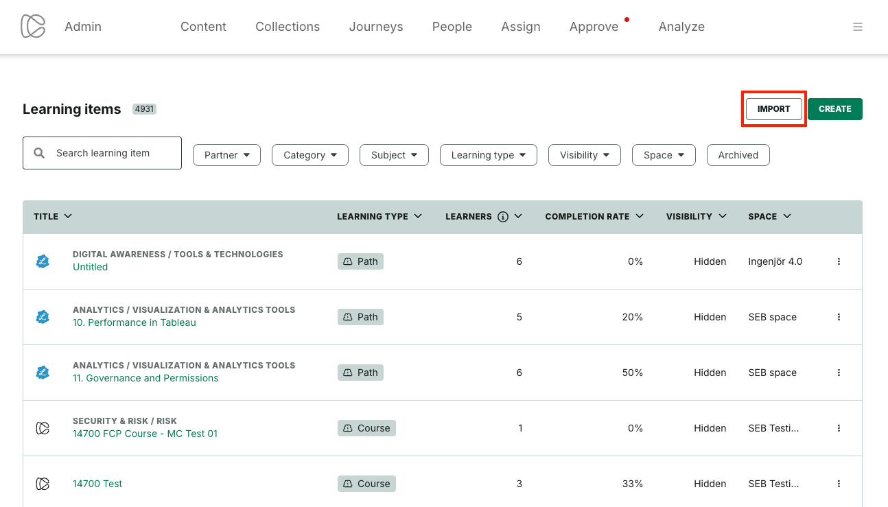 Partner content is imported using the Import button of the Content tab.