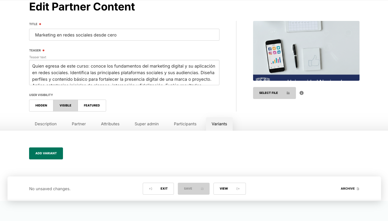 To edit an imported item, locate it in the Content tab and click its ellipsis menu to access its edit view. The edit partner content view looks as follows: